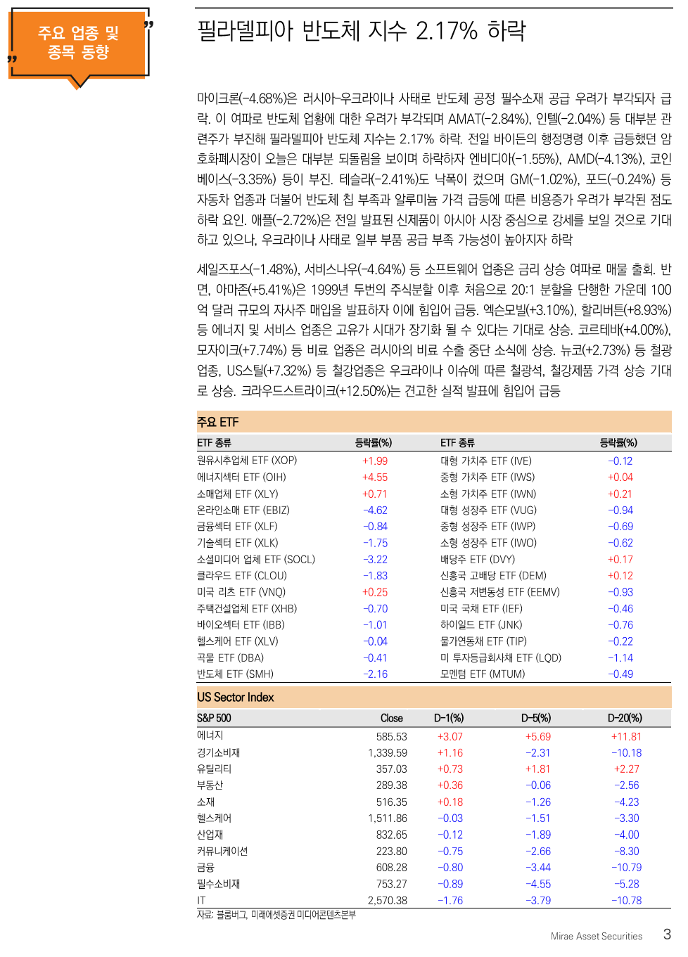 섹터별 ETF는 헬스케어(XLV/-0.1%)는 하락한 반면 자유소비재(XLY/+0.7%) 섹터는 상승 마감. 미국의 투자은행 제프리스의 Michael Yee 애널리스트에 따르면 백신 제조업체 모더나(MRNA)의 시장 가치가 지나치게 저평가 된 점을 지목하며 코로나 19 펜데믹 상황에 따른 백신 수요 감소가 주가 하락의 주된 요인으로 작용했다고 언급. 이에 모더나의 신규 의약품에 대한 수요 파이프라인이 주목받기 시작한다면 향후 주가는 상승 가능성을 예상. 반면, 모더나의 주가는 2.1% 하락한 139.5달러를 기록하며 헬스케어 섹터 하방 압력을 가중. 자유소비재 섹터에서는 글로벌 페스트푸드 업체 맥도날드(MCD)가 우크라이나 사태로 인한 러시아 내 일시적인 매장 운영 중단을 발표. 당사에 따르면 이번 조치로 매달 5000만 달러 이상의 비용이 발생할 것이라 언급하며 주가는 0.2% 가량 하락 하였지만 COVID-19가 경제에 미치는 경향이 다소 완화되며 익스피디아 그룹(EXPE/+2.4%)와 같은 여행 및 요식 관련 종목이 상승, 자유소비재 섹터 상승 압력을 지지.