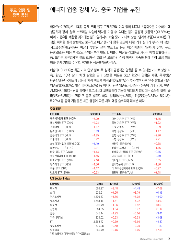 섹터별 ETF는 자유소비재(XLY/+1.7%)와 IT(XLK/+0.7%) 섹터가 상승 마감. 스포츠 의류 및 신발 제조 업체 나이키(NKE)는 오는 21일 실적 발표를 앞두고 있으며 글로벌 공급망 악화가 매출에 부정적 영향을 미칠 것으로 예상. 미국의 투자은행 제프리스에 따르면 글로벌 공급망 악화로 인한 매크로 불확실성이 심화되고 있다고 언급. 다만 당사는 경쟁사에 비해 높은 브랜드 가치를 지니고 있다고 말하며 투자의견을 ‘매수’ 및 목표주가를 185달러로 소폭 하향 조절. 반면, 나이키의 주가는 저가 매수세가 유입되며 1.8% 가량 상승, 자유소비재 섹터 상승 압력을 지지. IT 섹터에서는 글로벌 반도체 제조업체 엔비디아(NVDA)가 신제품 로드맵 공개를 앞두고 주가가 1.1% 상승하며 IT섹터 상승에 기인. 시장은 이번 행사에서 당사의 비즈니스 성장 전략 및 향후 매출 견인 가능성을 확인 할 수 있을 것이라 평가.