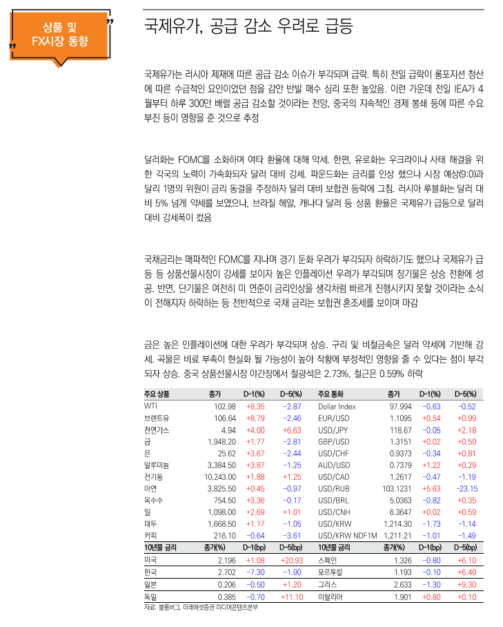 - WTI, IEA의 러 생산량 급감 전망 및 러 평화협정 난항에 8%대 상승 마감. NDF 원/달러 환율 1,211.1원 호가