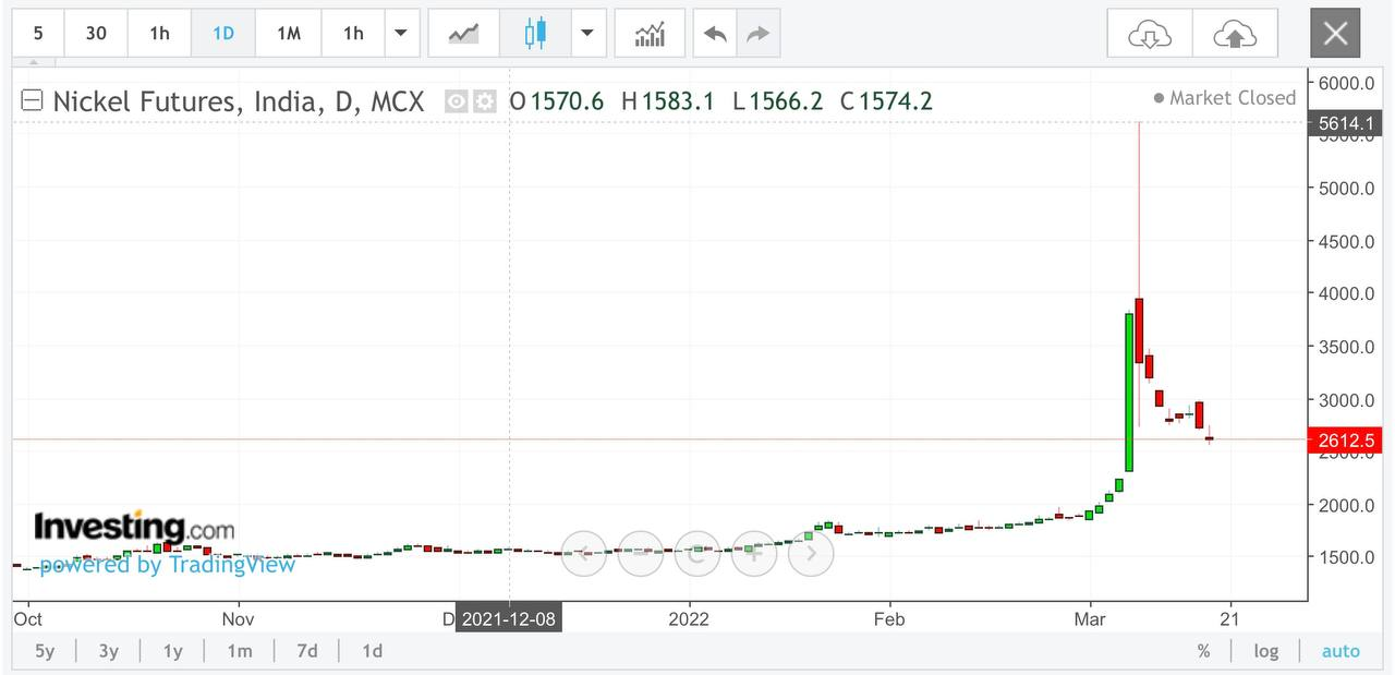 LME 니켈선물 거래 정지구간에 정지없이 계속 거래되었던 MCX 니켈선물은 현재 3/7 숏스퀴즈 고점대비 -54%수준이며, 오늘도 6% 하락