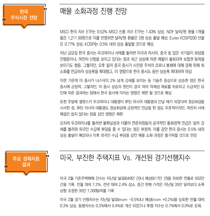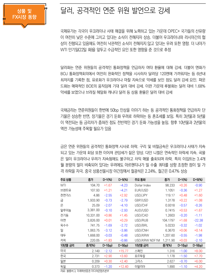 금일 뉴욕증시는 미국연방준비제도(Fed) 당국자들의 매파적인 발언에도 불구하고 저가 매수세가 유입되며 상승 마감. 제임스 불러드 세인트루이스 연방준비은행 총재는 올해 3%의 금리 인상을 주장하며 현재 미국연방준비제도의 금리 수준이 현저히 낮다고 평가. 또한 그 밖에도 크리스토퍼 월러 연방준비제도 이사는 인플레이션 압력이 심화될 경우 50bp의 금리 인상이 필요하다고 언급. 다만 러시아와 우크라이나의 지정학적 리스크를 고려하여 이번 정례회의에서 25bp의 금리인상을 주장하였지만 향후 인플레이션이 가중될 경우 50bp의 금리인상 필요성을 역설. 반면 러시아와 우크라이나의 전쟁 상황이 점차 불확실해지면서 안전자산에 대한 선호 심리 상승이 제기. ING 그룹에 따르면 전쟁 장기화에 따른 유럽 경제 펀더멘털에 대한 타격이 불가피해 질것이며 이에 따라 달러 인덱스는 100에 도달할 것이라 언급. 개별 기업으로는 여행 수요가 지속적으로 상승하며 주택 공유 서비스의 수요 또한 상승, 이에 향후 에어비앤비(ABNB/+6.0%)의 주가 상승 가능성이 제기.