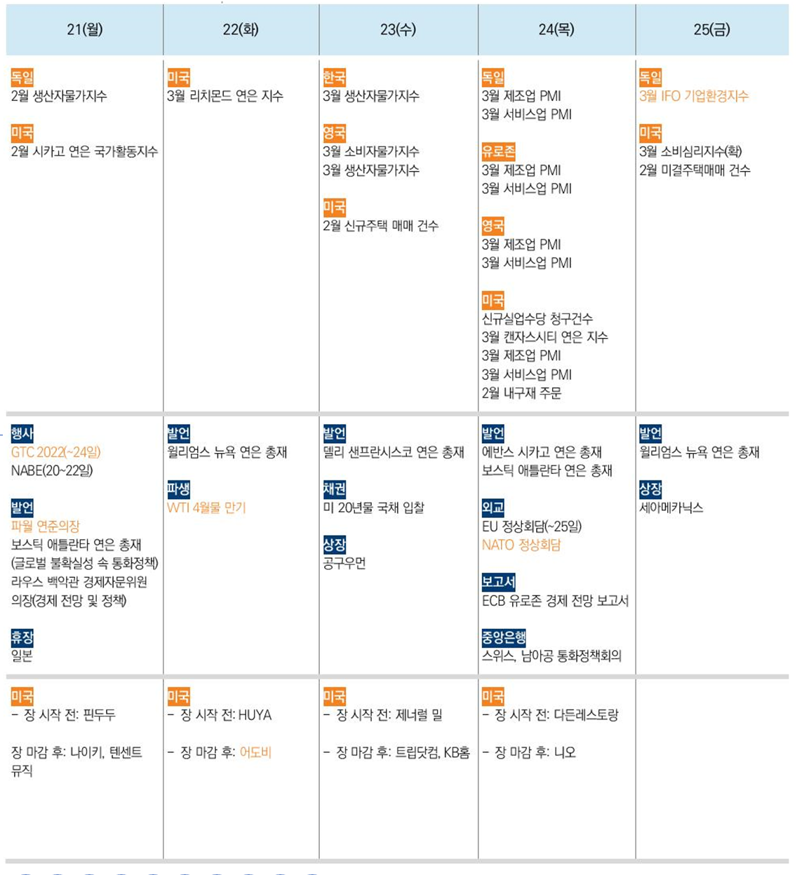 시장은 러시아-우크라이나 사태와 코로나19 상황을 지속해서 주시할 전망이며 이번 주 예정된. 내구재와 서비스 및 제조업 PMI 등 경제지표 일정에도 주목할 전망이다.