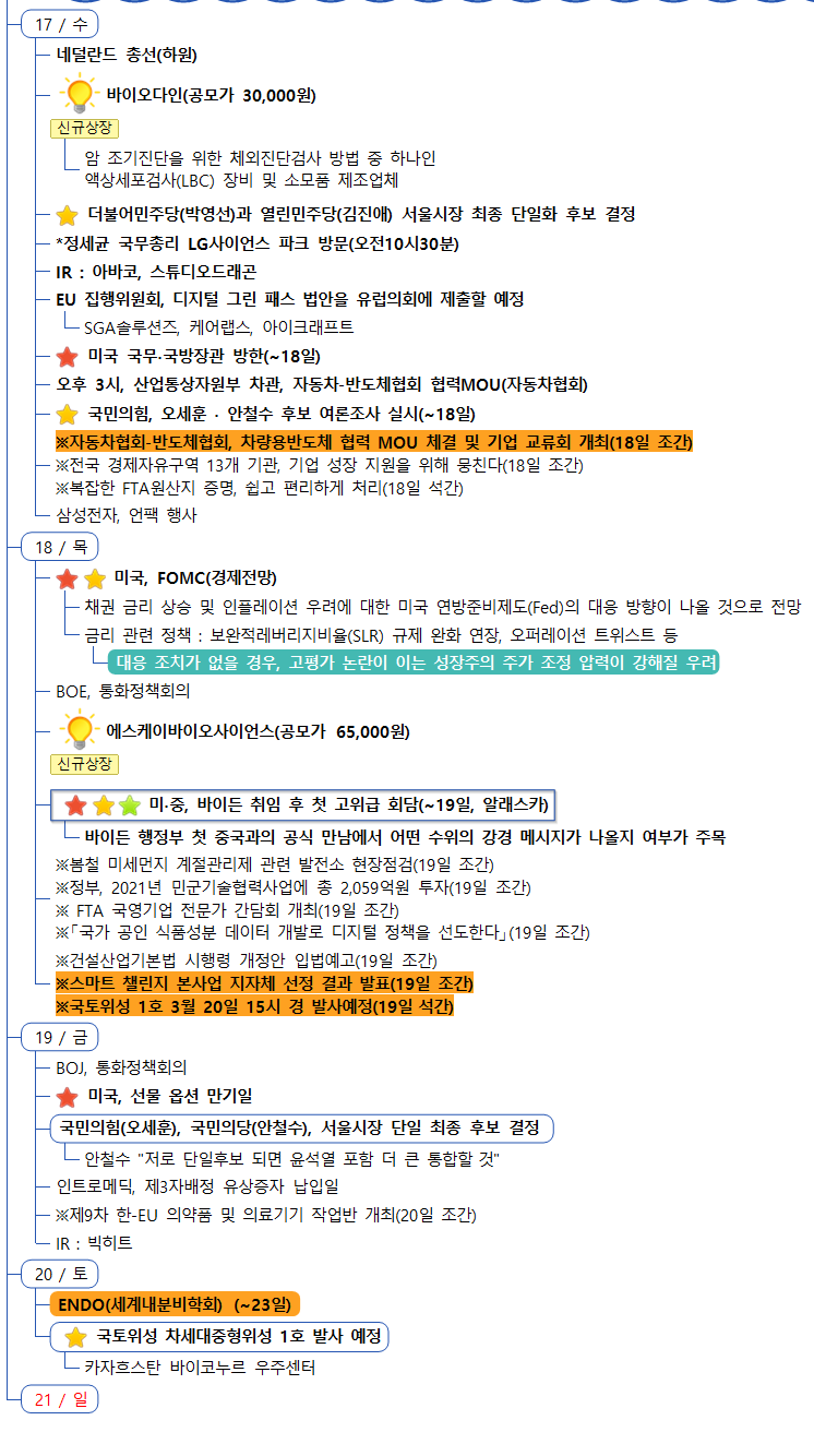 증시캘린더는 개인적으로 관련된 소식을 확인후 작성한 일정이라 변동 또는 오류의 소지가 있습니다.