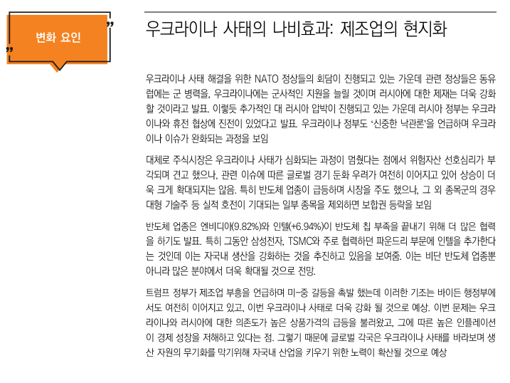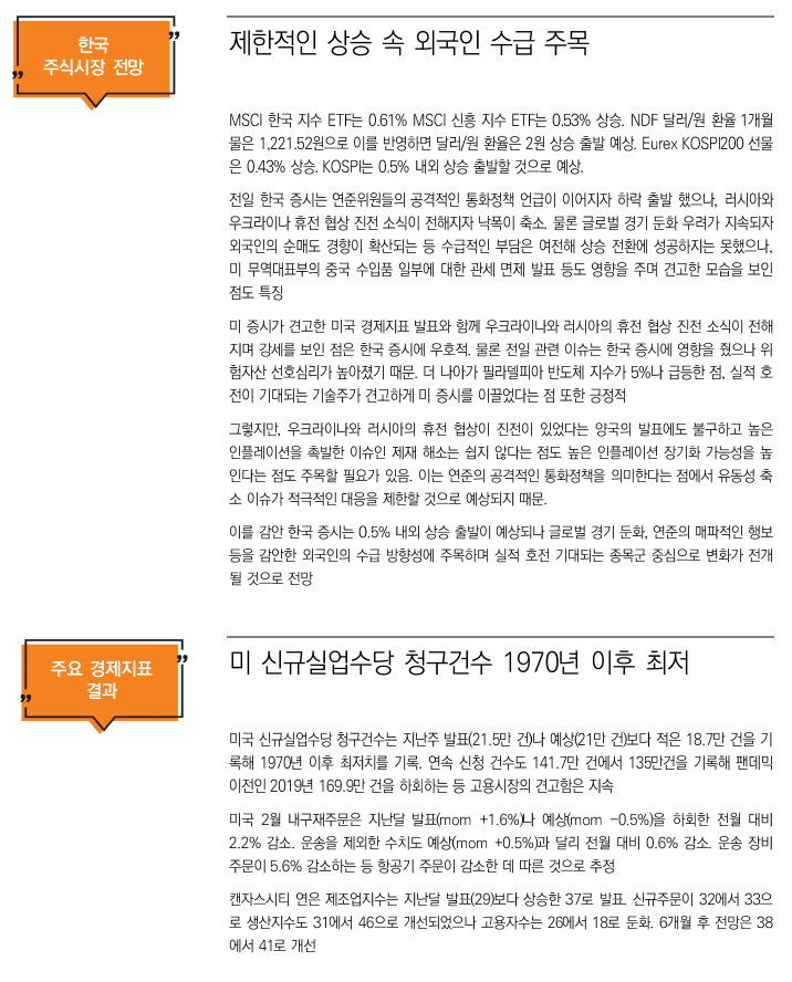 금일 뉴욕증시는 러시아의 추가 경제제재 및 미국의 긴축 통화 정책을 주목하며 상승 마감. 우크라이나의 지정학적 리스크가 지속하는 가운데 국제 유가가 배럴당 110달러를 넘으며 시장은 인플레이션 압력 상승 우려. 또한 미국의 주간 실업보험 청구 건수는 1969년 이후 최저치를 기록, 이에 미국 고용 시장 개선이 맞물리며 미국 연방준비제도(Fed)의 50bp 금리인상 가능성 언급. 반면, 미국의 경제 주간지Barron's에 따르면 인플레이션으로 인한 경기 침체 가능성은 낮다고 평가하며 금리 인상 사이클에서도 기업들의 견조한 실적세가 뒷받침 된다면 강세장이 이어질 것이라 예상. 또한 미국의 금리인상 사이클이 본격화 됨에 따라 달러 강세가 시현될 수 있다는 가능성이 제기. 오스트레일리아 상업은행 Westpac은 미국 연방준비제도의 매파적 기조에도 달러 강세가 나타나지 않고 있다며 금리 인상이 점차 진행되면서 달러인덱스가 100을 상회할 것이라 언급. 개별 기업으로는 미국의 수소전기차 제조업체 니콜라(NKLA)의 세미 전기 트럭 생산이 본격화 됨에 따라 주가는 5.7% 가량 상승. CNBC는 니콜라의 올해 400대 가량의 생산량을 예상했으며 2분기부터 차량 인도가 진행 것이라 보도.