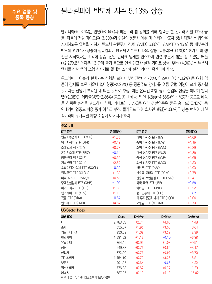 | PHLX 반도체지수 | 3,532.72 | 172.39 | 5.1% | 30/0/0 |