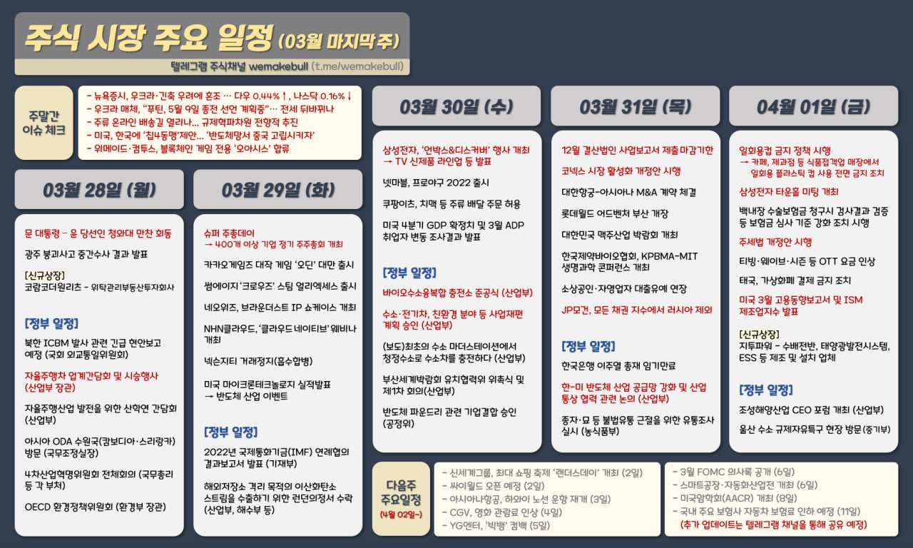 | 3월 30일(수) 증시캘린더 / 해외마감시황 (0) | 2022.03.30 |