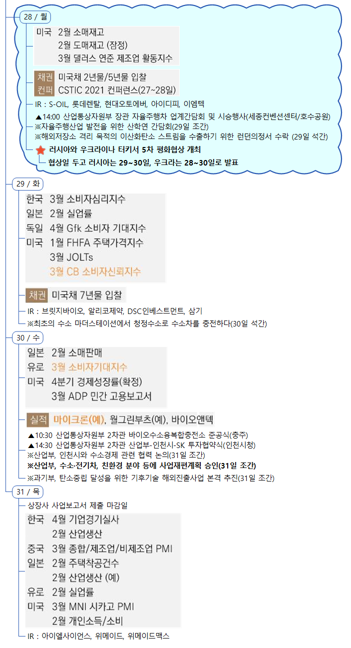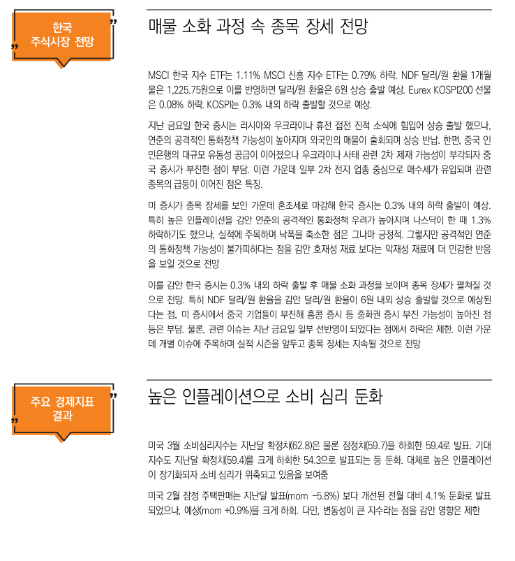 >금주 중국증시 숏 코멘트 : 3월 16일 저점 반등 이후 2차 하단 지지 테스트 구간 진입 예상. 러시아 침공 관련 불확실성 및 외국인 자금 유출 부담 지속. 내부적으로 신규 자금 유입 감소와 코로나19 확진자 증가가 투자심리를 여전히 제한. 금주 3월 PMI 발표 기대치 높지 않으나 금융안정 보장기금 출범 및 시장 안정 조치 발표는 업사이드 요인.