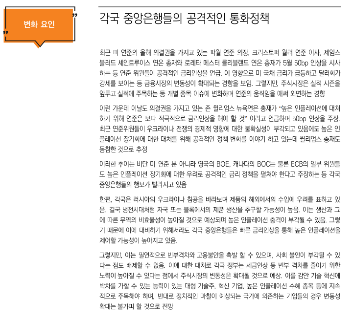 금일 유럽증시는 러시아 원유 수입 금지에 대한 합의 보류에 국제유가가 다소 진정되며 소폭 상승 마감. 나토회원국 정상은 러시아의 핵 위협에 대한 전투준비 강화에 대한 합의는 이루어졌으나 러시아산 원유 금수 조치에 대한 합의는 언급되지 않으며 국제 유가는다소 제한적인 움직임 시현. 이에 범유럽지수인 STOXX600은부동산 섹터가 상승을 주도하며 453.6선에 거래를 마감했으며 독일 DAX지수와 프랑스 CAC 지수를 포함한 유럽 3대지수 모두 상승 마감. 독일과 오스트리아가 러시아산 원유 금수 조치에 반대하는 입장을 표하며 회원국들간의 합의 도출에 난항이 예상되는 가운데 5월물 미국 서부택사스원유(WTI)는전장 대비 2.3% 하락한 배럴당 112달러를 기록. 시장은 또한 러시아와 우크라이나의 전쟁이 교착상태에 빠지며 올 하반기부터 유로 강세 가능성을 언급, 이에 미국의 금리인상 사이클을 주목하며 장 마감.