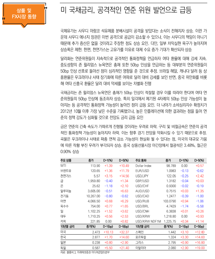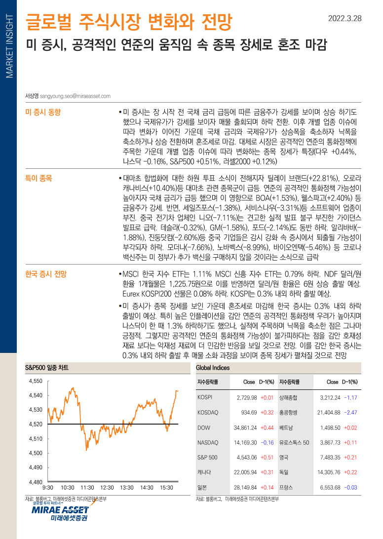 금일 뉴욕 증시는 러시아와 우크라이나의 지정학적리스크와 미국의 금리인상 사이클을 주시하며 혼조세 마감. 러시아와 우크라이나의 전쟁이 고착화 됨에따라 미국은 러시아에 대한 추가 제재 및 화학무기 사용에 대한 대응 의지를 밝히며 글로벌 공급망 악화 우려 상승.이러한 공급망 악화에 따른 인플레이션 상승 압력이 거세짐에 따라 미국 연방준비제도(Fed)의50bp 금리인상 가능성이 언급되며 올 6월까지 1.50%의 기준 금리를 예상. 한편 중국 내 스텔스 오미크론이 빠르게확산함에 따라 미국 내에서도 해당 변이 바이러스가 확산될 전망이 언급. 미국 질병통제예방센터(CDC)에 따르면 해당 바이러스는 미국의 북동부 지역에서 확산할 조짐을 보이고 있으며 고령인구가 많고 백신접종률이저조한 국가의 경우 사망률이 지속적으로 상승할 것이라 경고. 개별기업으로는 미국의 수소 전기 자동차생산기업 니콜라(NKLA/+4.7%)는 전기 세미 트럭 생산에 돌입,이에 이번 제품을 통해 당사의 기술력을 통한 성장 잠재력 확인 필요성이 언급.