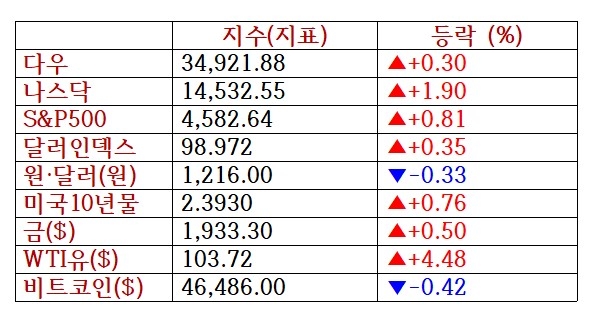 이날 뉴욕증권거래소(NYSE)에서 다우지수는 전 거래일 대비 103.61포인트(0.30%) 오른 3만4921.88에 마감했다. S&P500지수는 36.78포인트(0.81%) 상승한 4582.64에, 기술주 중심의 나스닥지수는 271.05포인트(1.90%) 뛴 1만4532.55에 거래를 마쳤다.