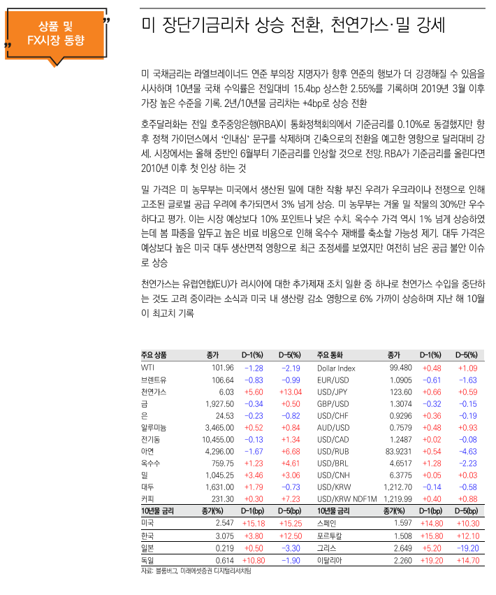 금일 뉴욕 증시는 러시아에 대한 추가 경제 제재 가능성이 거론되며 하락 마감. 유럽연합(EU)의 진행위원회는 러시아산 석탄 수입 금지 및 러시아 선박에 대한 입항 금지 조치를 제안하며 지정학적 리스크 상승에 따른 투자심리 악화를 야기. 또한 미국의 장단기 국채 수익률 역전 현상에 따른 경기침체 우려가 맞물리며 기술주 중심의 나스닥을 주도로 약세를 시현. 이에 글로벌 투자은행 뱅크오브아메리카의 Gonzalo Asis 애널리스트에 따르면 인플레이션 압력 상승에 따른 금리 인상 및 우크라이나의 지정학적 불확실성이 미 증시의 리스크 보상 비율 악화에 기인 한다고 언급하며 향후 지속적인 증시 하락 가능성에 무게. 이러한 불확실성 가중에 따른 안전자산 선호 심리와 산업용 귀금속의 수요 상승 예상이 잇따르며 시장은 향후 금 가격 움직임을 주목. 개별기업으로는 미국의 전자상거래 업체 아마존(AMZN/-2.6%)의 노동자 조합 설립 투표 가결로 당사의 비용 상승이 언급되며 주가 하방 압력 가중. 현재 동사의 노동자 조합은 풀필먼트 노동자의 시급을 기존 18달러에서 30달러로 인상을 주장하며 향후 추가적인 노동자 조합원 증가에 따른 운영 비용 상승이 예상.