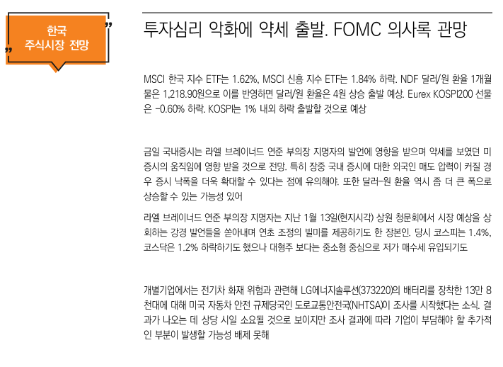 테마별 ETF는 기술혁신(ARKK/-5.6%)ETF와 반도체(SOXX/-4.6%)ETF가 하락 마감. 웰스파고는 다국적 전자상거래 기업 쇼피파이(SHOP)의 높은 벨류에이션을 언급하며 이를 통해 당사는 지속적인 성장세를 시현 할 것이라 평가. 또한 쇼피파이의 향후 신규 부가가치 상품 및 서비스 출시로 매출 증가세를 기록 할 것이라며 834달러의 목표주가를 제시. 반면 이러한 평가에도 불구하고 쇼피파이의 주가는 3.4% 하락하며 기술혁신 ETF의 하락 요인으로 작용. 한편 반도체 섹터에서는 스마트폰 시장의 수요 둔화가 예상되며 반도체 제조 업체 퀄컴(QCOM)의 성장세에 대한 비관론이 거론. 또한 당사의 22년 주당순이익(EPS) 전망치는 시장예상치를 하회하는 수치인 11.7달러로 언급, 이에 주가는 5.4% 하락하며 반도체 섹터의 하락 요인으로 작용.