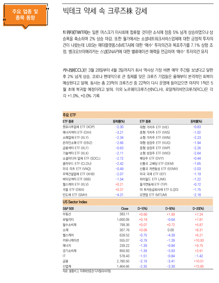 섹터별 ETF는 자유소비재(XLY/-2.3%)섹터가 하락한 반면 헬스케어(XLV/+0.3%)섹터는 상승 마감. Wedbush의 Nick Setyan 애널리스트는 글로벌 커피 프랜차이즈 업체 스타벅스(SBUX)의 경영진 교체 및 자사주 매입 중단을 언급하며 스타벅스의 불확실성 상승을 예상. 이러한 소식에 스타벅스의 주가는 4.5% 하락하며 자유소비재 하락을 주도. 반면 헬스케어 섹터에서는 제약업체 화이자(PFE)가 오는 5월 3일 실적 발표를 앞두고 코로나19 장기화에 따른 지속적인 매출 상승이 주목. 또한 현재 중국내 코로나19 재확산에 따른 화이자 백신 대량 주문 가능성이 거론되며 당사의 주가는 0.7% 상승한 51달러를 기록, 이에 헬스케어 섹터의 상승을 지지.