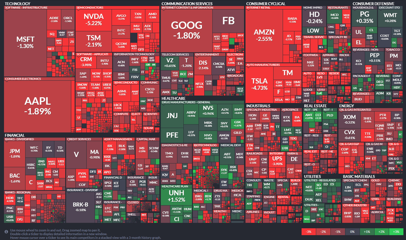 이날 뉴욕증권거래소(NYSE)에서 다우지수는 전 거래일 대비 280.70포인트(0.80%) 내린 3만4641.18에 마감했다. S&P500지수는 57.52포인트(1.26%) 하락한 4525.12에, 기술주 중심의 나스닥지수는 328.39포인트(2.26%) 떨어진 1만4204.17에 거래를 마쳤다.