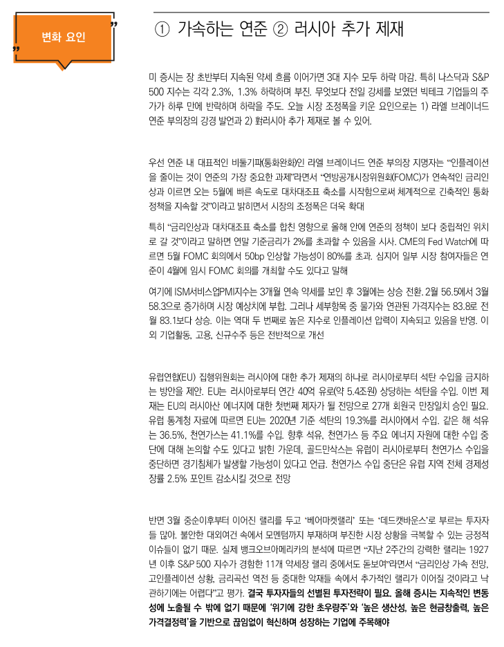 •전일 테크 급등에 따른 피로도로 소폭 약세 시작한 증시는 대표적 비둘기 성향의 브레이너드 연준위원의 50bp 금리인상 가능성 재확인과 빠른속도의 연준 자산매각에 대한 확인으로 빠르게 차익실현 매물 발생
