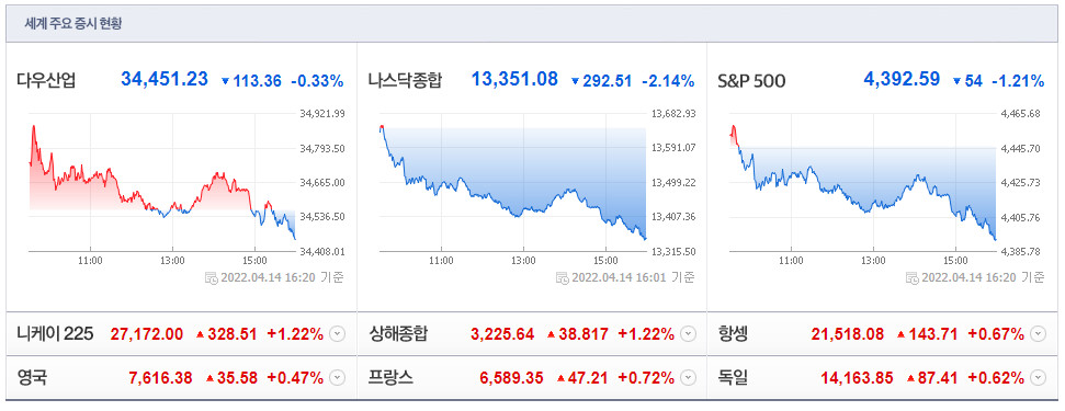 | 4월 14일(목) 증시캘린더 / 해외마감시황 (0) | 2022.04.14 |