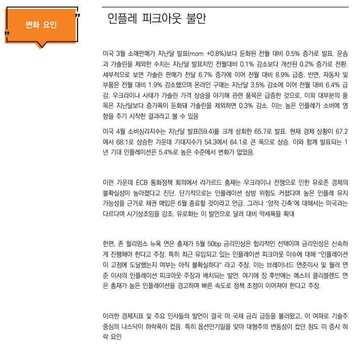 금일 미국 증시는 주요 은행들의 실적이 예상치를 상회하였다는 소식에도 불구하고 미 연준(FED)의 공격적인 긴축 재정 정책에 대한 우려로 하락 마감. 모건스탠리(MS)의 분기 주당순이익(EPS)와 영업이익은 각각 2.02달러, 148억 달러로 애널리스트 예상치인 1.68달러, 142억 달로 보다 상회. 씨티그룹(C) 또한 실적이 각각 2.02달러, 192억 달러로, 애널리스트 예상치 1.55달러와 181억 5천만 달러 보다 상회한 실적 기록. 하지만, 웰스파고(WFC)는 예상을 하회하는 실적에 장중 하락 마감. 금일 발표된 경제지표로는 3월 소매판매로 전월 대비 0.5% 증가한 6천 657억 달러로 집계되었으며, 이는 전문가들이 집계한 예상치 0.6% 보다 밑도는 수준. 9일 기준으로 한 주간 실업보험 청구 건수는 18만 5천 명으로 집게 되어 월가 예상치 보다 상회. JFD Group은 러시아-우크라이나 전쟁이 근시일 내 끝나지 않을 것이며, 주요국 중앙은행들의 통화긴축은 가속화 되는 가운데 증시 변동성은 더욱 가속화 될 것이라고 언급.