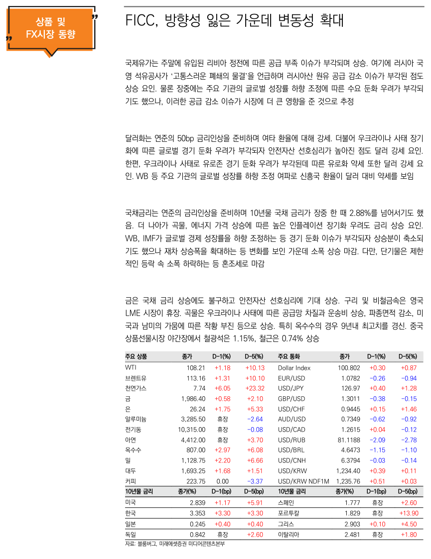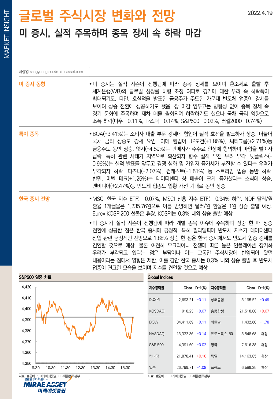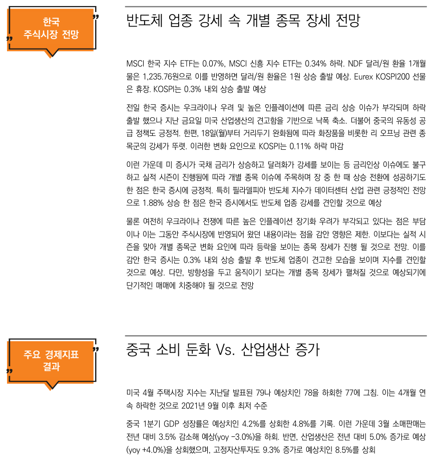 금일 미국 증시는 주요 기업들의 실적 발표와 미 연준(FED)의 긴축 우려 등을 주시하며 혼조세 마감. 펙트셋에 따르면, 현재까지 실적을 발표한 기업들의 81.5%가 애널리스트 추정치를 상회하는 실적 발표. 2022년 1분기 실적을 발표한 기업들은 약 7.5% 이며, 애널리스트들은 S&P500 상장 기업의 1분기 주당순이익(EPS)이 전년 동기 대비 5.3% 증가 했을 것이라고 예상. 지난주에 이어 오늘은 주요 은행들이 실적을 발표하였으며, 다가오는 주에는 넷플릭스와 테슬라 등 주요 기술 기업들이 실적을 발표할 예정. 한편, OCBC Bank는 미 연준(FED)이 인플레이션을 통제할 수 있을 정도의 긴축 정책을 달성하지 못한 상태이며, 다가오는 5-6월 FOMC에서 50bp 금리인상 예상. 이어 Nikko Asset은 중국의 코로나 바이러스 재확산으로 인해 봉쇄령을 시행하여, 08년 금융위기 이후 가장 심각한 경제활동 차질을 경험하고 있다고 언급.