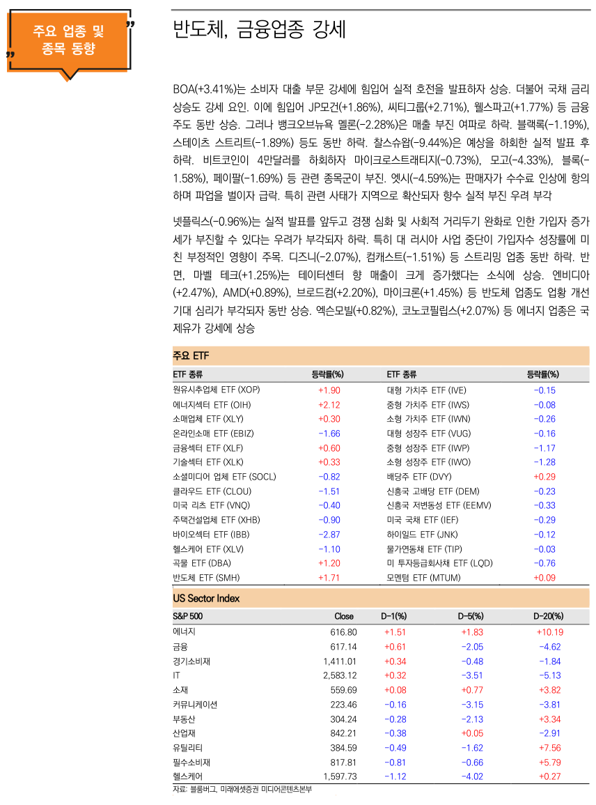 금일 테마 ETF에서는 반도체(SOXX/+1.7%), 기초소재(IYM/+0.6%), 글로벌천연자원(GNR/+0.4%)이 상승한 반면, 생명공학(IBB/-2.9%)과 IPO(IPO/-3.0%) 테마는 하락 마감. 미즈호 증권은 시냅틱스(SYNA/+4.5%)에 대한 투자의견을 유지하면서 모놀리딕파워시스템(MPWR/+4.0%)과 함께 반도체(SOXX) 테마 상승 견인 마감.