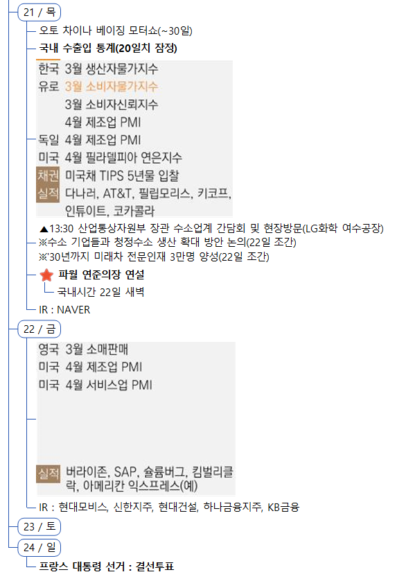 | 4월 21일(목) 증시캘린더 / 해외마감시황 (0) | 2022.04.21 |