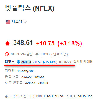 (1) 넷플릭스 유료 구독자수가 10년 만에 처음 감소하며 시간외서 25% 하락중입니다.