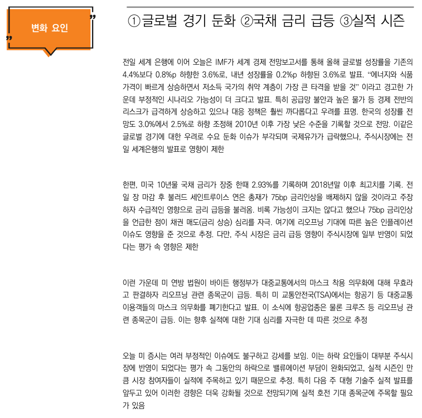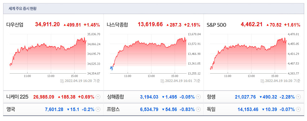 금일 미국 증시는 금리 상승 및 세계 경제 성장 둔화 우려에도 불구하고, 주요 기업들의 실적을 발표를 주시하며 상승 마감. 다우지수에 포함되어있는 존슨앤드존스(JNJ)는 예상을 상회하는 분기 실적 보고 후 상승 마감. 금일 장 마감 후에는 주요 기술 기업 넷플릭스(NFLX)와 IBM(IBM) 또한 실적을 발표할 예정. 미국교통안전청(TSA)은 연방 법원의 결정에 따라 대중교통 및 항공기 이용시 마스크 착용을 의무화 하지 않겠다고 발표. 이에 항공주들은 상승 마감. 한편, 국제통화기금(IMF)은 우크라이나-러시아 여파 등을 이후로 세계 경제성장률을 4.4%에서 3.6%로 하향 조정하였으며, 미국의 성장률은 3.7%에서 2.3% 하향 조정. 이어, 미 연방준비은행 총재 제임스 블러드 세인트루이스는 금리 인상 압력을 부추기는 발언에 투자자들의 금리 인상 우려는 더욱 고조.