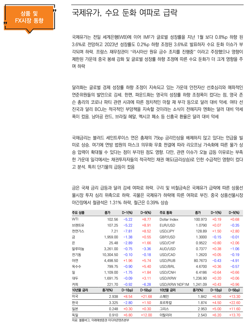 한편 국제통화기금(IMF)이 우크라이나 전쟁을 이유로 올해 세계 경제성장률 전망치를 하향조정한 것이 유가 급락을 불렀다. IMF는 이날 세계경제전망 보고서에서 올해와 내년 전세계 국내총생산(GDP) 성장률 전망치를 각각 3.6%로 전망했다. 올해 전망치는 0.8%p, 내년 전망치는 0.2%p 낮췄다.