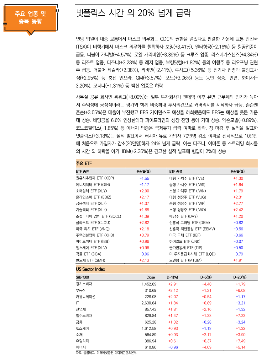 대형 기술주들이 실적 기대감으로 강세를 보였다. 마이크로소프트 주가는 1.70%, 구글 모기업인 알파벳 주가는 1.83% 뛰었다. 넷플릭스는 정규장에서 3.18% 상승했다. 하지만 장 마감 직후 1분기 실적 발표에서 구독자 수가 10년 만에 처음 20만명가량 줄었다는 소식에 시간 외 거래에서 20% 넘게 빠졌다.