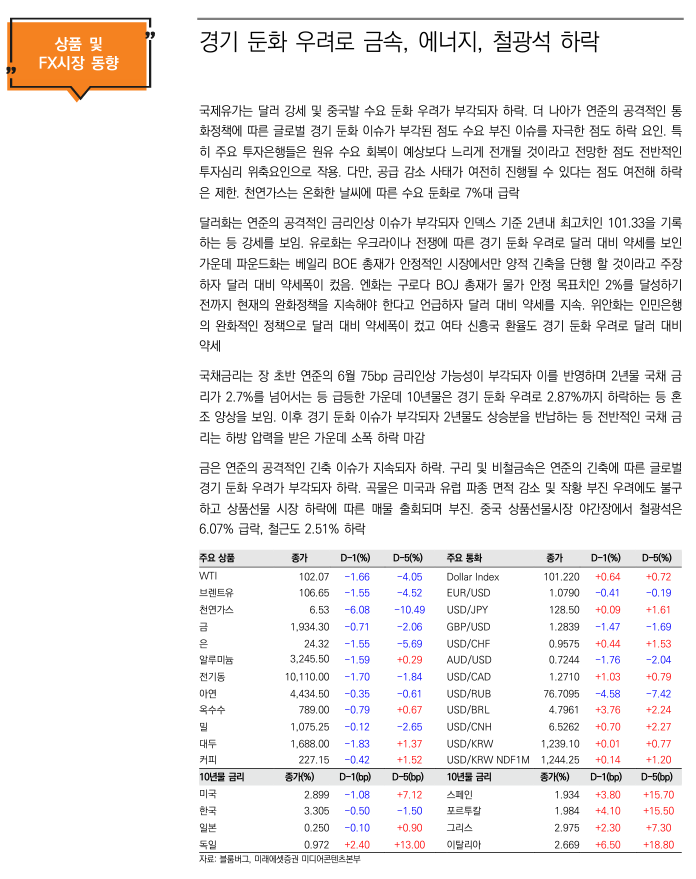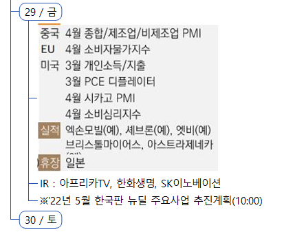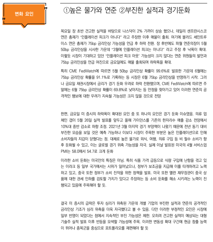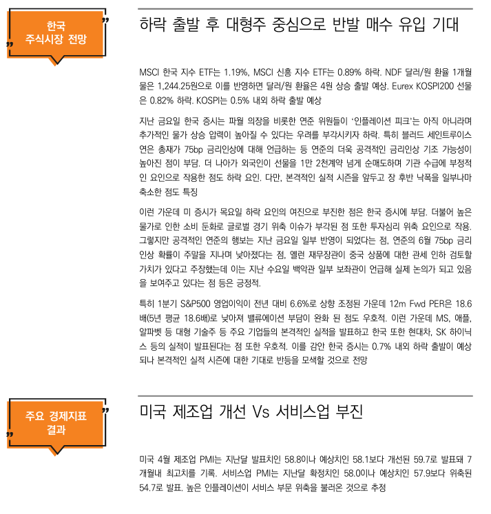 금일 미국 증시는 전일 제롬 파월 의장의 발언, 기업들의 실적 및 경제지표 등을 발표하면서 하락 마감. 전일 진행되었던 토론에서 미 연준(FED)의 제롬 파월 의장은 다가오는 5월에 0.5% 금리 인상 가능성을 열어 두며, 더 빠르게 금리 인상하는 것이 적절하다고 언급. 이에 5월, 6월 연속으로 금리 인상 가능성에 투자자들은 위축된 모습. 금리 선물 시장에서 트레이더들은 기준 금리 인상 가능성을 93%로 예상. 주요 기업의 실적 발표로는 아메리칸익스프레스(AXP)가 예상을 상회하는 실적에도 불구하고, 시장 조정 압력을 받으며 하락 마감. 버라이즌(VZ)은 가입자 수가 감소하며 하락. 금일 발표된 경제 지표로는 4월 제조업 구매관리지수(PMI)는 7개얼 이내 최고치를 경신하였으나, 서비스업 PMI 지수 예상치는 54.7로 3개월 만에 최저치 기록. 뉴욕증시 전문가들은 연준의 공격적 금리 인상 우려와 채권 금리 상승이 주가에 타격을 주고 있다고 분석.