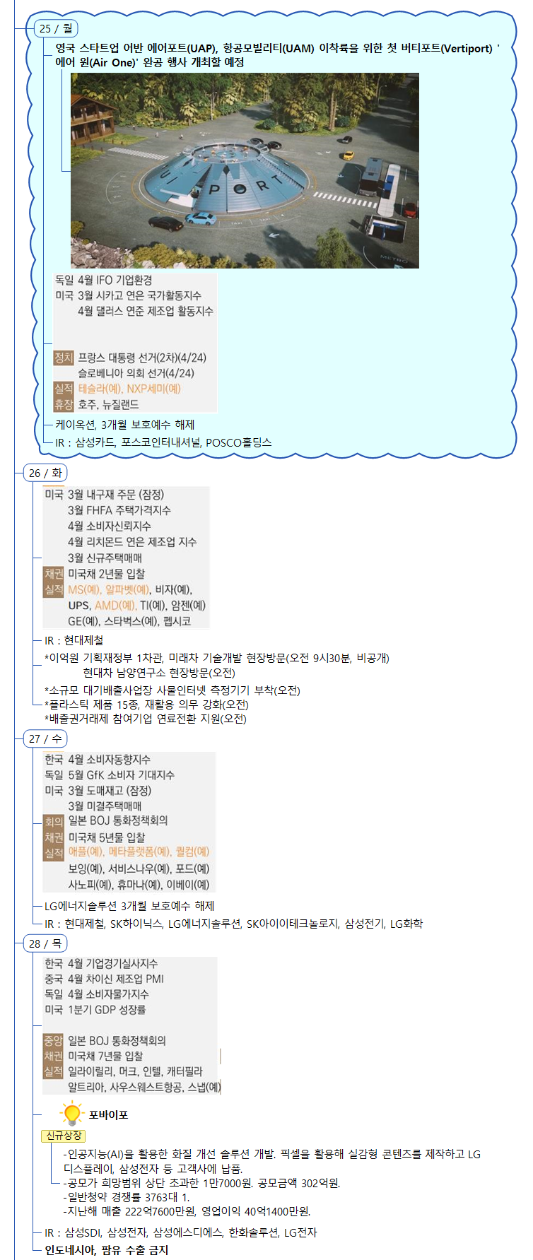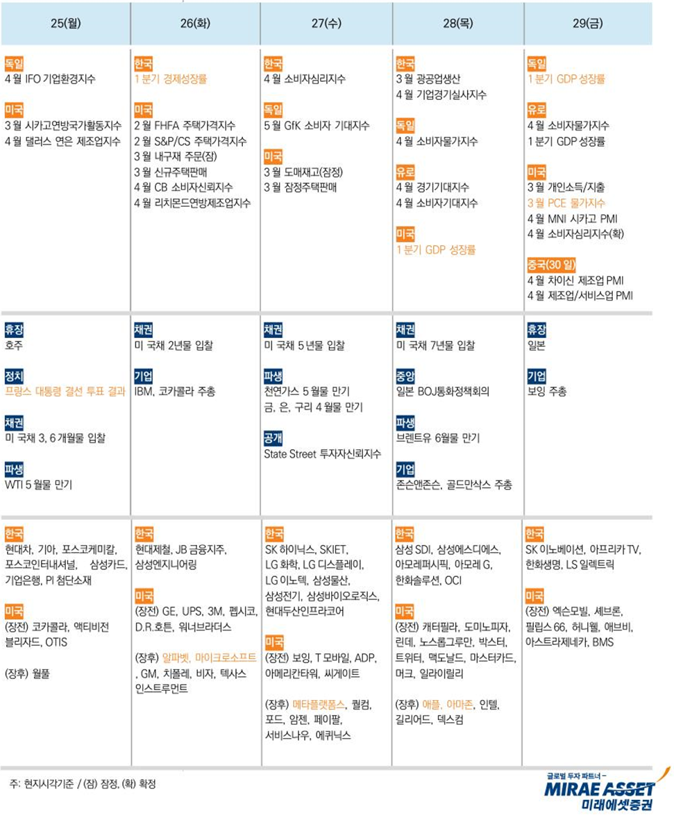 또 미국 주요 경제 지표 발표도 예정돼 있다. 올해 1분기 국내총생산(GDP) 성장률과 연준이 선호하는 물가지표인 3월 개인소비지출(PCE) 가격지수 발표를 앞두고 있다. 시장의 전망과 실제 발표치와의 격차가 시장에 영향을 미칠 것으로 보인다.
