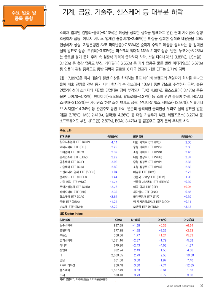 섹터별 ETF에서는 필수소비재(XLP/-1.5%), 자유소비재(XLY/-2.3%), 금융(XLF/-3.0%), 헬스케어(XLV/-3.6%), 소재(XLB/-3.7%) 등 시장의 조정 영향을 받으며 일제히 모든 섹터 하락 마감. 뉴코(NUE/-8.3%)는 동종 업계 중에서 최악의 실적을 발표 후 하락 마감. 이어 프리포트맥모란(FCX/-6.8%)와 함께 소재(XLB) 섹터 하락 견인 마감.