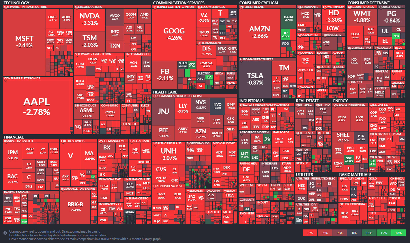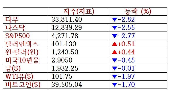 이날 다우존스30 산업평균지수는 전장보다 981.36포인트(2.82%) 급락한 33,811.40에 거래를 마쳤다. 다우존스 마켓데이터에 따르면 지난 2020년 10월28일 이후 가장 큰 폭의 하락이다. 스탠더드앤드푸어스(S&P) 500 지수는 121.88포인트(2.77%) 떨어진 4,271.78에, 기술주 중심의 나스닥 지수는 335.36포인트(2.55%) 떨어진 12,839.29에 각각 장을 마감했다.