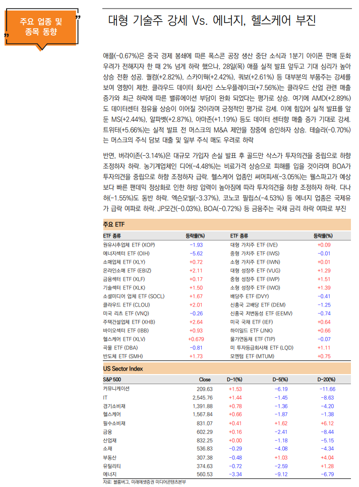 섹터별 ETF 에서는 IT(XLK/+1.5%), 커뮤니케이션(XLC/+1.4%), 헬스케어(XLV/+0.7%)가 상승 하였으나, 유틸리티(XLU/-0.7%), 에너지(XLE/-3.3%) 섹터는 하락 마감. 슐럼베르거(SLB/-7.1%)는 세계 최대 유전 서비스 제공업체로써 배당금을 40% 인상과 함께 예상을 상회하는 1분기 수익 기록. 하지만, 중국의 봉쇄령으로 수요 감소 및 경제 성장 둔화가 예상됨에 따라 할리버턴(HAL/-6.3%)과 함께 에너지(XLE) 섹터 하락 견인 마감.