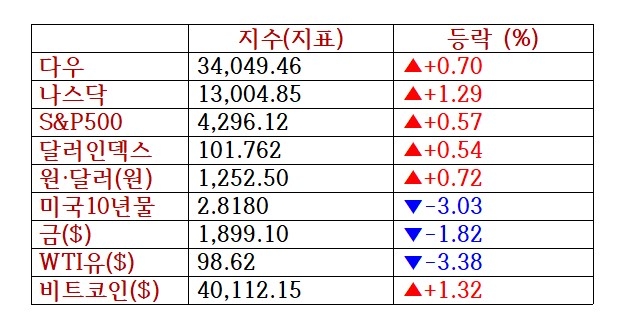 | 지수 | 종가 | 등락폭 | 등락률 | 상승/하락/보합 |