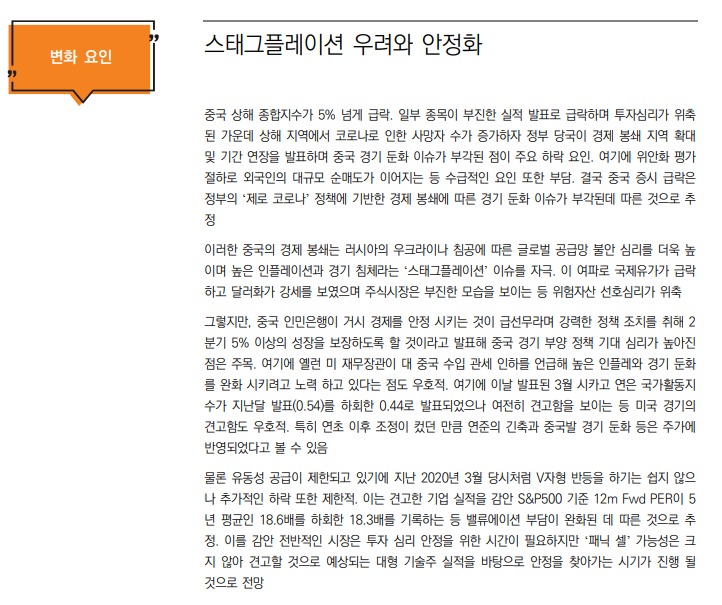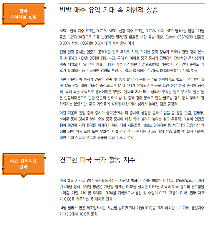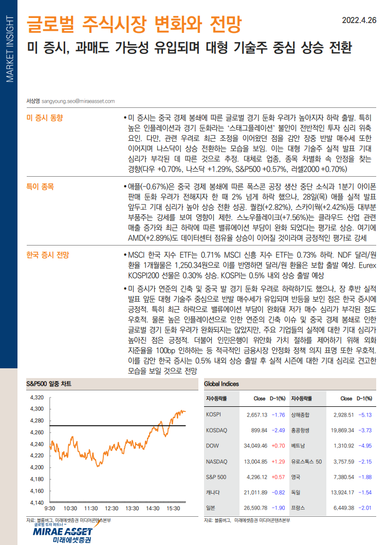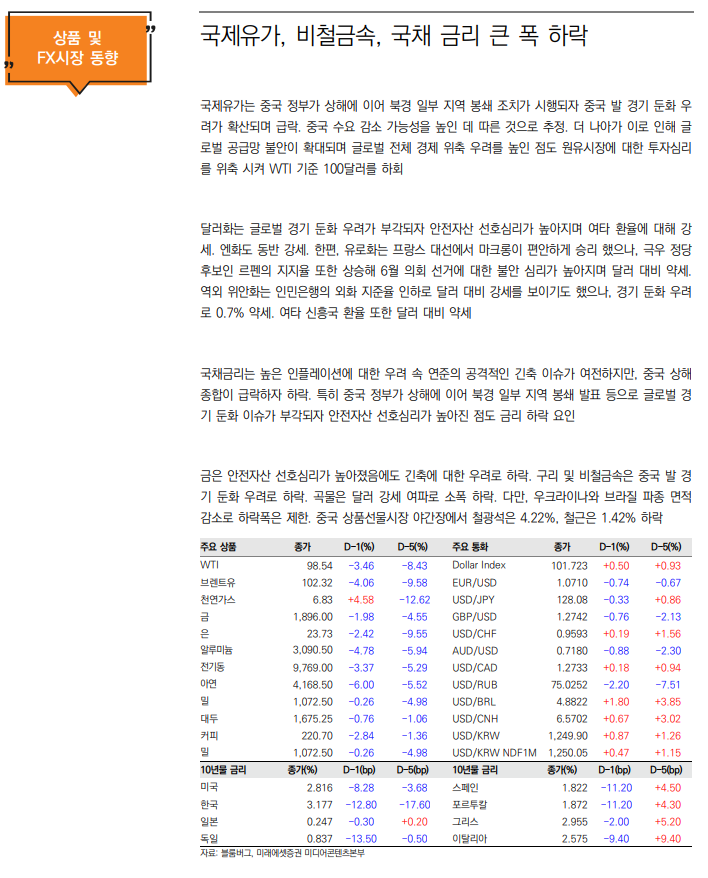 금일 미국 증시는 중국의 코로나 발생으로 인한 봉쇄 조치 및 공급망 문제 등 악재 속에 주요 기업들의 실적 발표를 앞두고 상승 마감. 중국은 상하이에 이어 수도 베이징 일부 지역도 봉쇄 조치를 시작하였으며, 인구 350만 명의 베이징 차오양구 일부 지역을 통제지역으로 정하고, 특별한 사유가 아니면 거주 단지 밖으로 나가지 못한다고 발표. 이에 글로벌 공급망 문제는 가속화 될 것으로 예상되며, 소비 심리 위축에 국제 유가 또한 하락. 한편, 이번 주에는 마이크로소프트(MSFT/+2.5%), 알파벳(GOOGL/+2.9%), 메타(FB/+1.6%), 애플(AAPL/+0.7%), 아마존(AMZN/+1.2%) 등 주요기업들의 실적 발표 예정. 실적이 예상치를 상회할 경우 투자 심리 개선 예상. 금일 발표된 경제지표로 시카고 연방준비은행이 발표한 미국의 3얼 전미활동지수(NAI)는 0.44를 기록하면서 전달 대비 0.1 하락. 전미활동지수가 ‘0’보다 상회할 경우 미국 경제가 전체적으로 과거보다 평균적으로 성장세에 있다는 것을 의미.