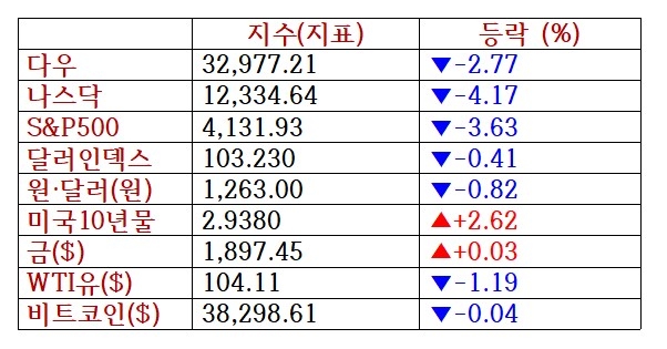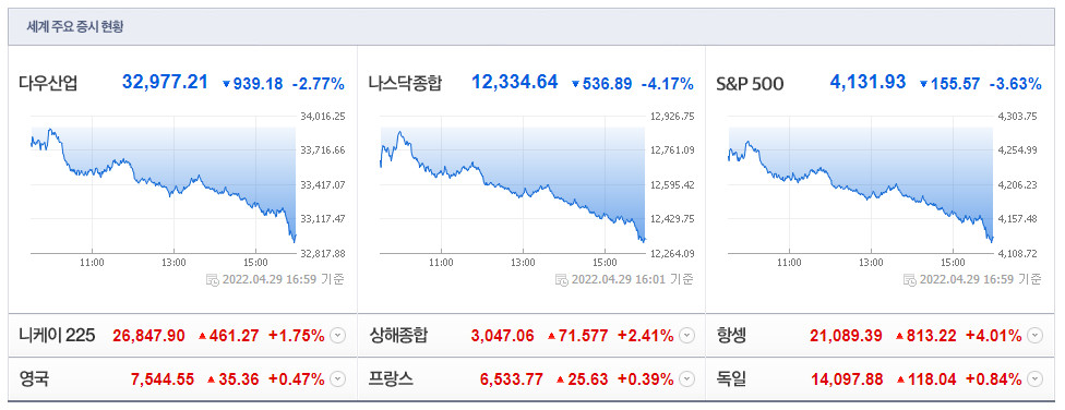 29일(미 동부시간) 뉴욕증권거래소(NYSE)에서 다우존스30산업평균지수는 전날보다 939.18포인트(2.77%) 내린 32,977.21로 장을 마감했다. S&P500지수는 155.57포인트(3.63%) 하락한 4,131.93으로, 나스닥 지수는 536.89포인트(4.17%) 내려 12,334.64로 거래를 마쳤다.