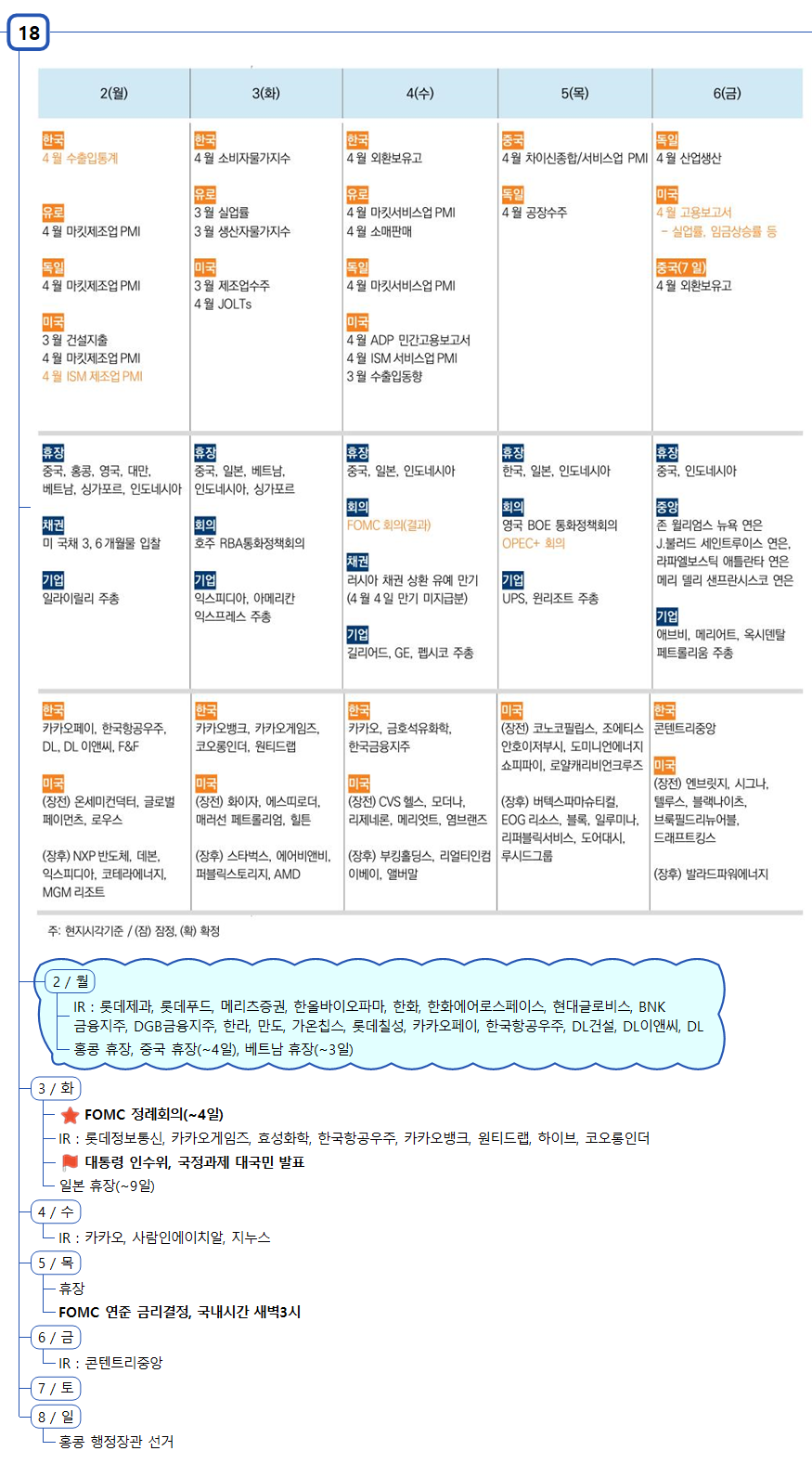 - 금주 일정 : 중국 노동절로 2~4일 휴장 / 미국 FOMC 5일(목) 결과 새벽 발표