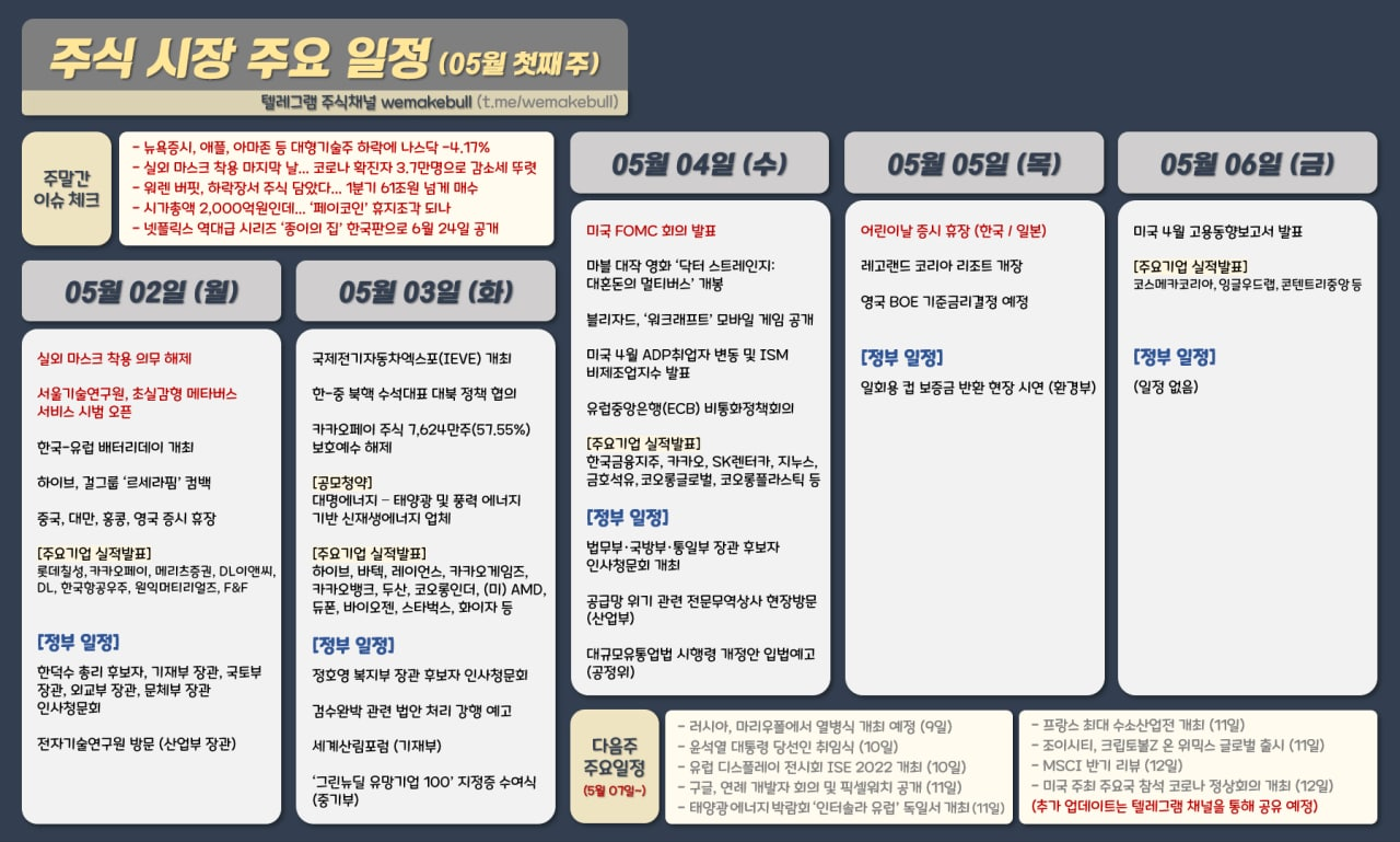 | 5월 4일(수) 증시캘린더 / 해외마감시황 (0) | 2022.05.04 |