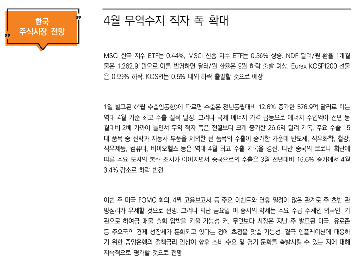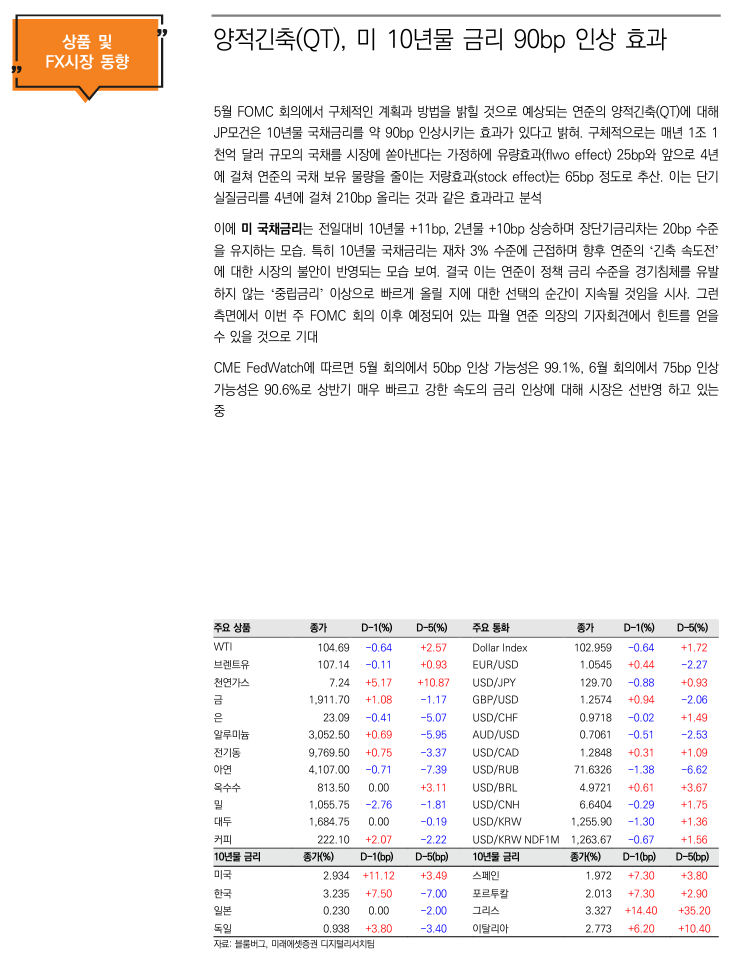 ▲ 주말 해외동향 : 나스닥 4% 급락. 5월 FOMC 경계감에 미국채 10년물 2.93%까지 재상승. 적자를 낸 아마존 14% 급락했고 은행/에너지 등 가치주군도 동반 하락. 중국 플랫폼 규제 완화에 핀둬둬(+13.5%) 등 중국 ADR만 호조