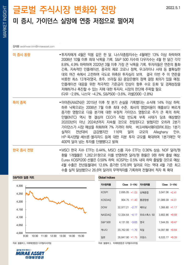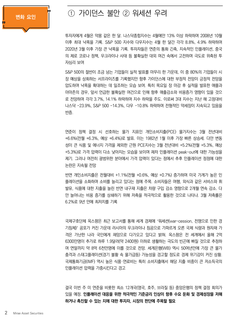 금일 미국 증시는 주요 기업들의 실망스런 실적 발표와 경제 지표 발표에 하락 마감. 전일 애플(AAPL/-3.7%)은 예상을 상회하는 실적을 발표하였으나, 중국의 도시 봉쇄로 공급망에 차질이 생기면서 다음 분기에 40~80억 달러의 매출 손실이 발생할 것이라고 보도 후 투자 심리 약화. 이어 아마존(AMZN/-14.1%)은 7년 만에 처음으로 분기 손실을 기록하며 장 중 급락하며 마감. 올해 S&P500지수와 나스닥 지수는 각각 10%, 22% 하락하며 1970년, 1973년 이후 최악의 하락률을 기록. 금일 발표된 경제지표로 미 연준(FED)이 선호하는 물가 지표인 개인소비지출(PCE) 가격 지수는 40년 만에 최고 수준을 유지하며 전년 동기 대비 6.6% 상승. 이는 월스트리트저널(WSJ)의 예상치인 6.4% 보다 상회한 수치. 이에 연준(FED)는 다음주 예정인 연방공개시장위원회(FOMC) 정례회의 에서 기준금리를 50bp 인상하고, 양적 긴축 정책을 실시할 것으로 예상.