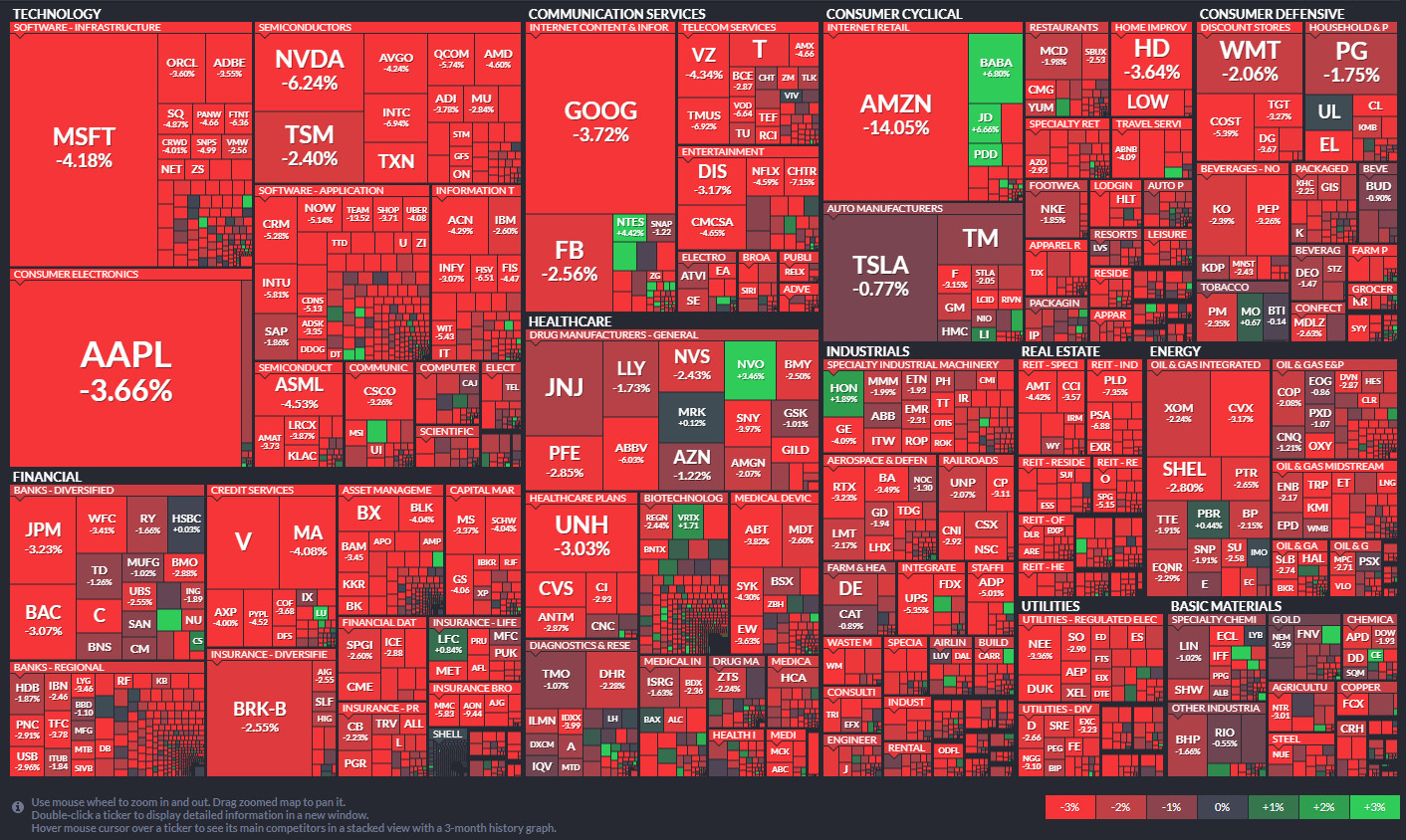 아침 Amazon의 10%수준 하락영향으로 약 1.3% 하락 시작한 나스닥은 아침부터 강력하게 유입되는 적극매수세(올해 들어 가장 강력한 장초반 적극매수세)로 잠시 반등을 시도하였으나, 이후 빅테크를 중심으로매도세가 장마감까지 지속적으로 출회되며 종가 저가 수준으로 마감하였습니다.