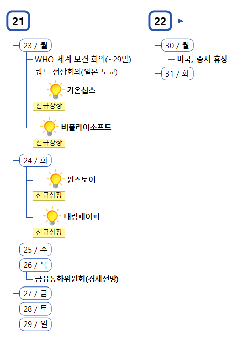1) 증시캘린더는 개인적으로 관련된 소식을 확인후 작성한 일정이라 변동 또는 오류의 소지가 있습니다.