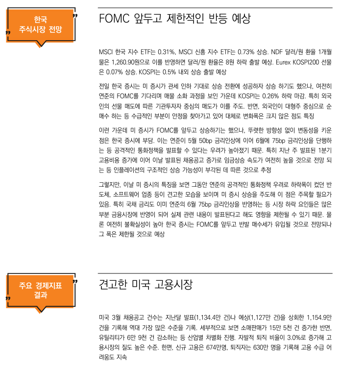 미국 증시는 연준(FED)의 FOMC 회의에 주목하며 상승 마감. S&P500지수는 0.5% 상승한 4,175선에서 거래를 마쳤고, 다우지수는 0.2% 상승해 33,128.79에 마감. 나스닥 지수는 0.2% 오른 12,536.76에 마감. 투자자들은 연준(FED)의 5월 연방공개시장위원회(FOMC) 정례회의를 주시. 연준은 이번 회의에서 금리를 50bp 인상하고 대차대조표를 축소하는 양적 긴축(QT)을 발표할 것으로 전망. 이날 닐 카시카리 미니애폴리스 연은 총재는 새로운 높은 인플레이션 시대가 이미 도래했을 수 있으며 물가 2% 목표치 수준으로 되돌리기 위해 매우 공격적인 조치를 해야 할 것이라고 발언. 한편, 미국의 천연가스 가격이 2008년 금융 위기 이후 최고 수준으로 급등하며 에너지 관련주가 급등하며 증시 상승을 주도. 이날 발표된 경제지표로는 미국 3월 채용공고 건수는 1천154만9천 건으로 역대 가장 많은 수준을 기록. 미국의 3월 공장재 수주 실적은 전월 대비 2.2% 상승하며 시장 예상치를 상회하며 공장재 수주가 증가세로 전환. 시장에서는 금리인상 결정 등을 담은 연준의 정책보고서에 주목, 한국시간 5월 5일 새벽에 발표될 예정.