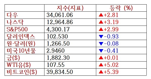 기준물인 10년만기 미 국채 수익률은 전일비 0.12%p 급등한 3.04%로 2018년 이후 4년만에 최고 수준을 기록했다.