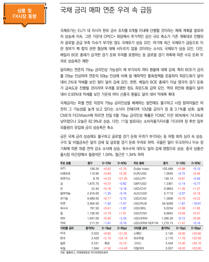 - 또한 러-우 사태도 highly uncertain 이라고 표현했네요. 이런 상황에서 75bp 인상은 물가 잡으려다 경기 잡을 수도 있어 경계하겠지요.
