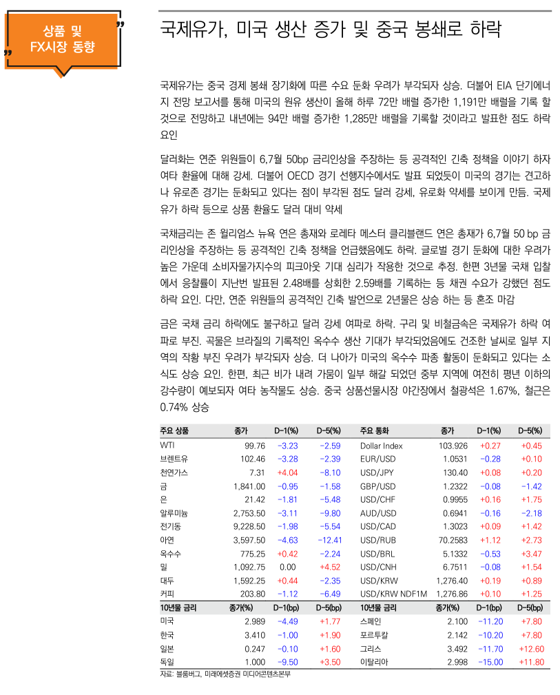 유럽증시는 저가매수 유입에 상승 마감 / 글로벌 경제 둔화에 대한 우려에 인한 매도세 이후 저가매수세가 유입된 모습 / 한편, 중국의 코로나 재확산, 러시아 전쟁, 인플레이션 우려 등은 여전히 지속하며 추가 상승을 제약 / 유럽중앙은행(ECB) 위원들은 최근 유로존 인플레이션이 사상 최고치를 기록해 통화 정책을 보다 정상홍해야한다는 것에 대해 목소리를 높이고 있는 상황