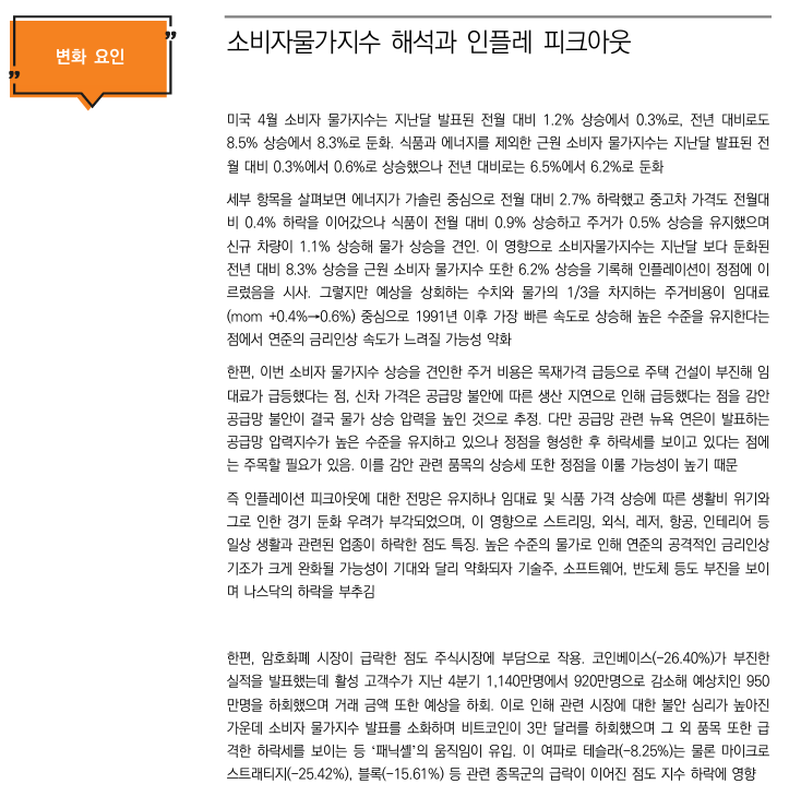 4월 CPI는 전년 동월보다 8.3% 올라 40여년 만의 최대폭이었던 3월(8.5%)보다는 상승폭이 다소 줄었으나, 시장 전망치(8.1%)를 상회해 인플레이션이 예상보다 더 지속될 가능성을 시사했다. 개장 전 시간외 거래에서 일제히 오름세를 보이던 뉴욕증시의 3대 지수는 CPI 발표 후 하락세로 돌아섰다.