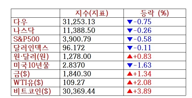 미국 증시는 인플레이션 우려 지속에 하락 마감. S&P500지수는 0.6% 하락한 3,900선에서 거래를 마쳤고, 다우지수는 0.8% 하락해 31,253.13에 마감. 나스닥 지수는 0.3% 내린 11,388.50에 마감. 전일 대형 유통업체 월마트와 타깃의 실적 부진으로 인플레이션 급등에 따른 기업들의 어려움이 본격화됐다는 진단에 이어 이날 발표된 주요 기업들의 실적도 여전히 부진한 모습을 보이며 시장의 투자심리가 악화. 연준(FED)은 인플레이션 억제를 위해 공격적인 긴축에 나서는 상황 속에서 경기침체를 유발할 수 있다는 우려가 지속. 재닛 옐런 미국 재무장관은 이날 독일에서 열린 G7 재무장관회의에서 지구촌 전체가 고물가 속에서 성장이 둔화하는 스태그플레이션 위험에 빠질 수 있다고 경고. 과거 금융시장 버블을 예측했던 제러미 그랜섬 월가 투자자는 최근 증시 하락세가 2000년 ‘닷컴 버블’보다 심각하다는 우려도 제기. 이날 발표된 경제지표로는 지난 14일로 끝난 한 주간 실업 보험 청구자수가 전주보다 2만1천 명 증가한 21만 8천 명으로 집계해 시장 예상치를 상회. 5월 필라델피아 연은 지수는 2.6으로 전월 17.6보다 큰 폭으로 하락하며 경기가 확장 국면은 유지했으나 제조업 활동이 전월보다 크게 둔화한 모습. 증시 전문가들은 인플레이션이 기업들의 수익에 영향을 미치고 있으며 당분간 시장의 높은 변동성이 지속될 것으로 전망.