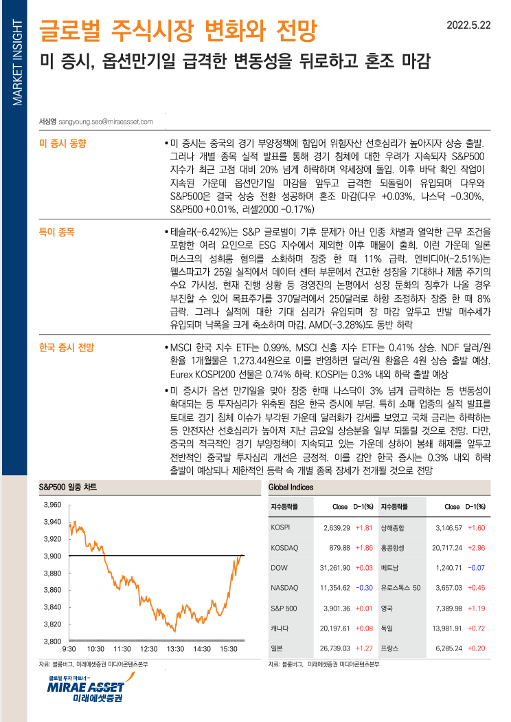 5월 옵션 만기일인 오늘 시장은 오후 나스닥 전저점인 11,000p 레벨을 비교적 강력하게 방어하였고, 특히 장중 Tesla, Nvidia는 -10%수준까지 하락 후 하락폭을 상당부분 만회