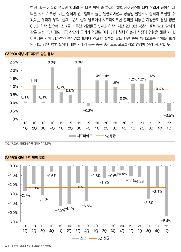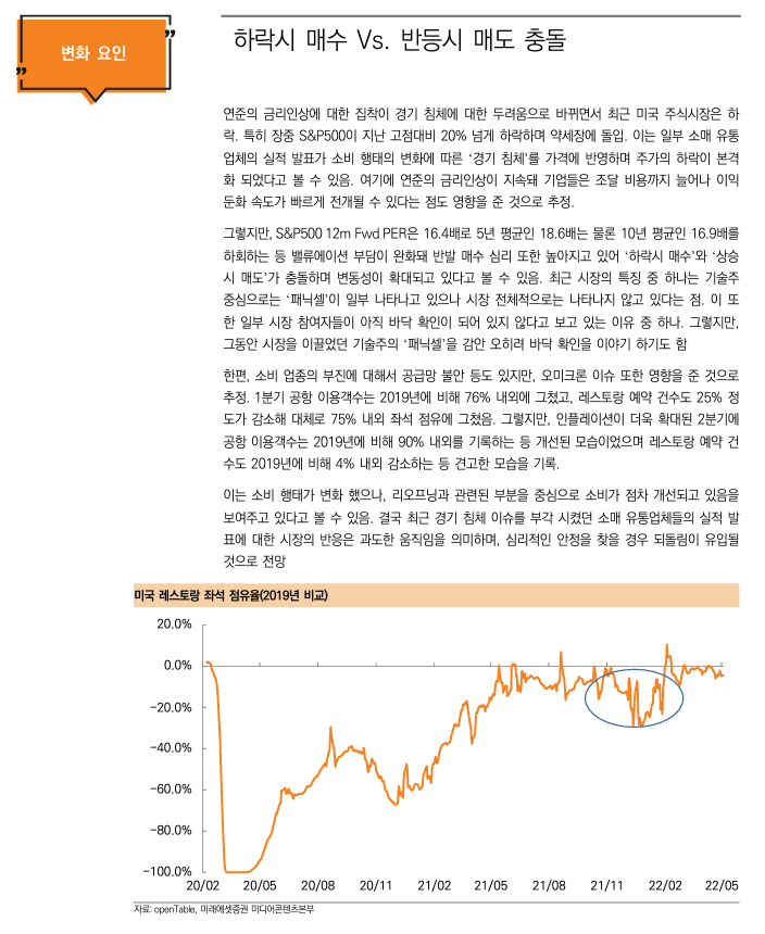 ▲ 종합판단 : 불확실성 잔존하나 실질금리 플러스 반전 등 감안하면 긴축으로 인한 Sell-off 정점 통과 예상. 점진적 우상향 관점. 단가 인상과 투자 확대가 핵심. 인플레 구간에서 이익 창출력 배가되는 Value 포지셔닝 강화